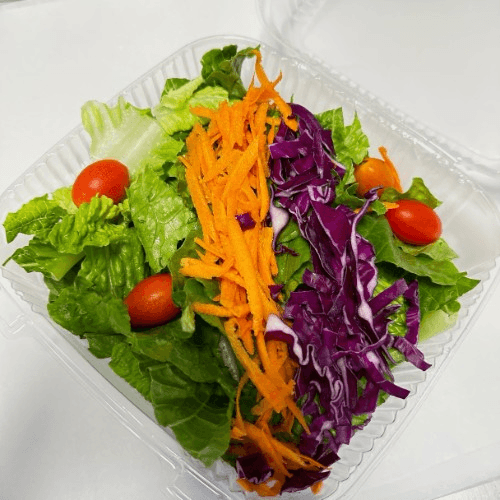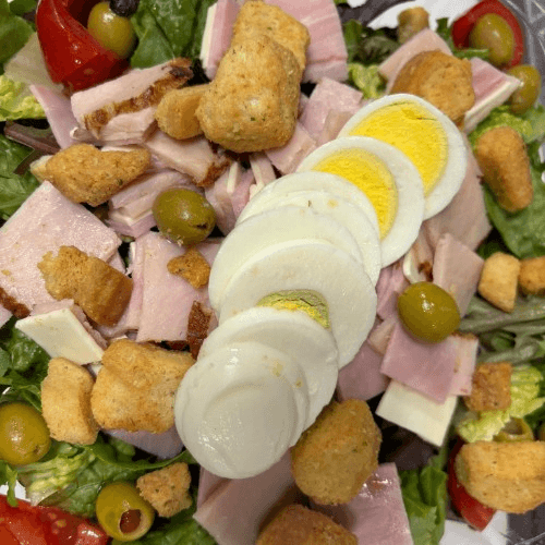 Iceberg or romaine lettuce, spinach, mixed lettuce, cucumbers, peppers, olives, broccoli, croutons, roasted peppers